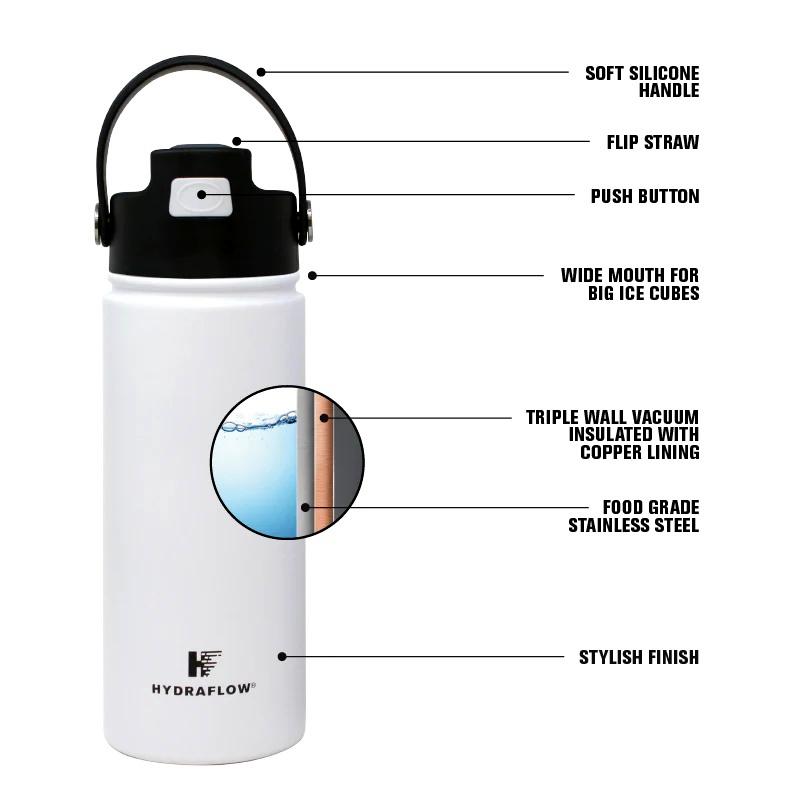 This fabulous Hydraflow Hybrid Pastel Rainbow Cheetah Print Stainless Steel Triple Wall Vacuum Flip Top Bottle w/Handle & Silicone Boot really stands out with it's gorgeous fierce cheetah/leopard print! The pastel rainbow features yellow, green, aqua, blue, purple, pink, and orange ombre as they all fade into one another around this beautiful bold print bottle.