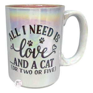 This stylish Spectrum Designz All I Need Is Love... And A Cat (Or Two Or Five) Iridescent Large Ceramic Coffee Mug is the perfect gift for the cat and coffee lover in your life... maybe it's you! Both sides of the mug include duplicate graphics.