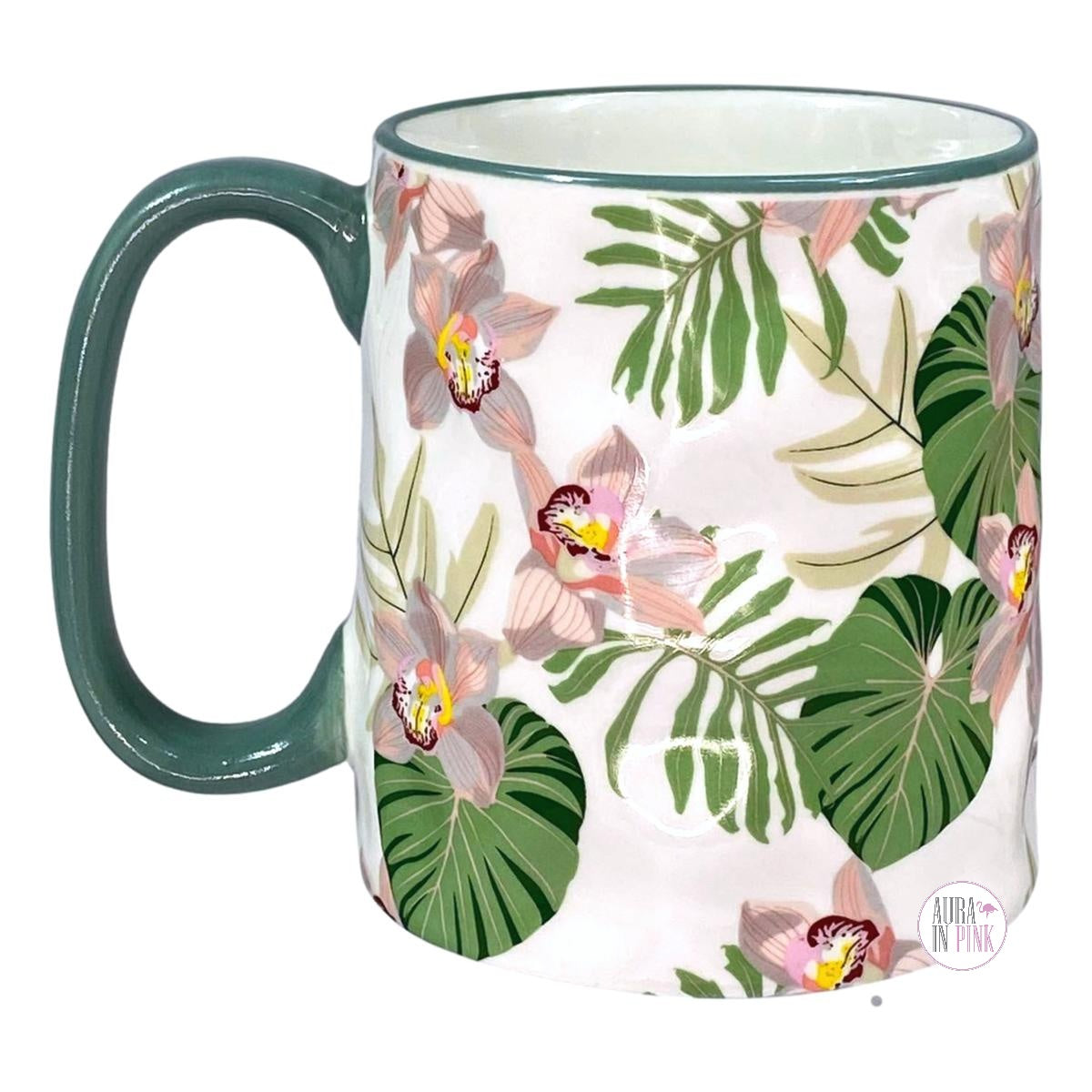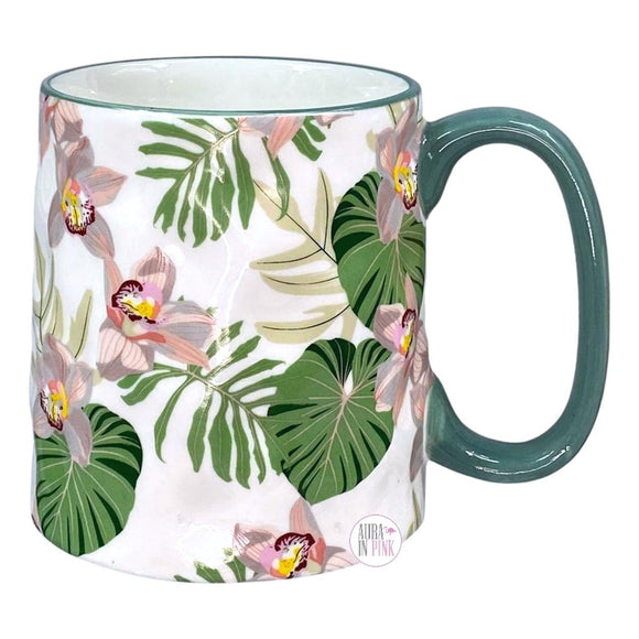 10 Strawberry Street Artisan Collection Orchids & Monstera Leaves Tropical Foliage Tumbled Ceramic Coffee Mug