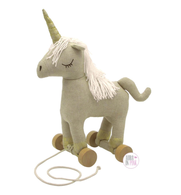 Ce luxueux jouet à tirer licorne rustique ajoute la touche finale parfaite au décor de la chambre de votre Mini Diva! De haute qualité et minimaliste, cette magnifique créature magique comprend une crinière en fil blanc, des sabots et une alicorne en tissu doré, une corde à tirer et des roues en bois qui fonctionnent vraiment!