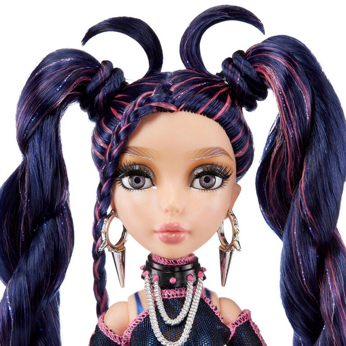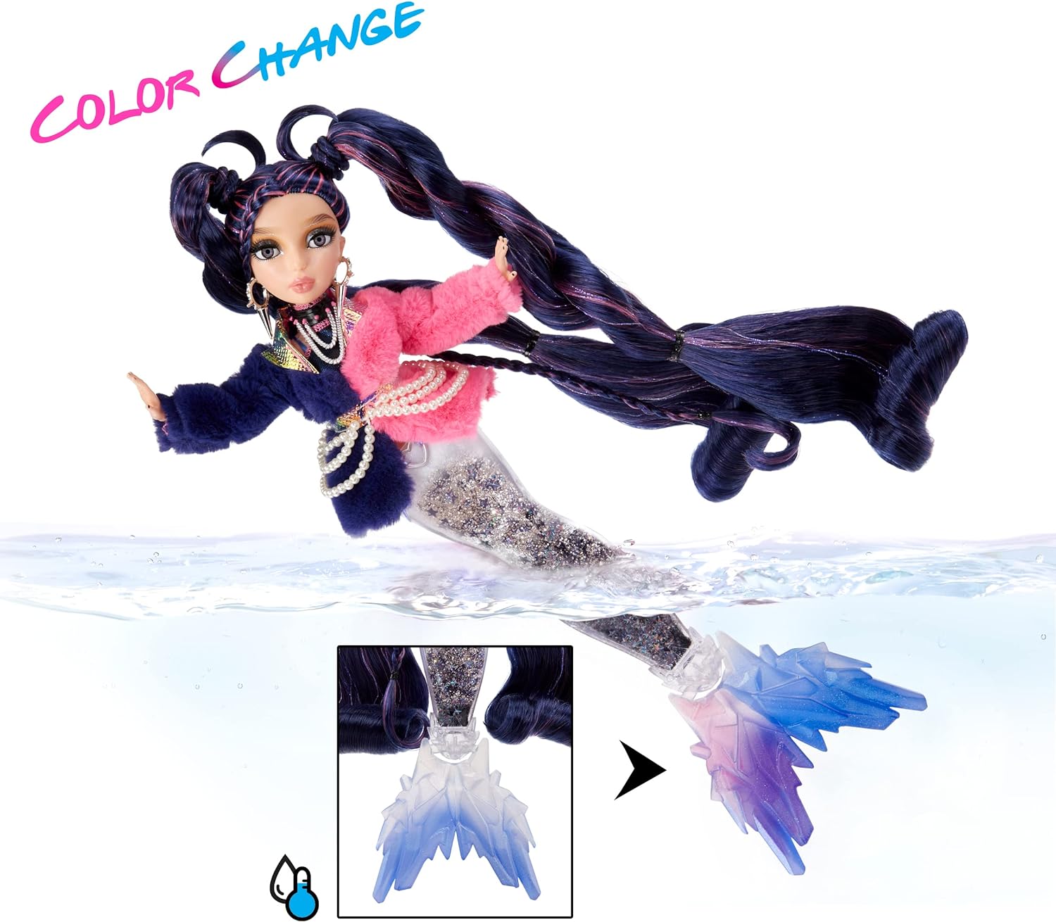 Nera has star-shaped glitter! Flip her up and down a few times to see the glitter swirl around! Nera has a unique, sculpted fin that performs a magical color change when submerged in ice cold water. Her fin changes from ombre purple to half pink and purple! Nera is wearing a mesh high-neck crop top and purple and pink color block faux fur jacket with iridescent lapels. Her accessories include silver spike earrings, chain necklace, a pearl chain belt, studded purse and moto-jacket inspired cross body bag. Expand play with all new accessories that include a "shell" phone, mug and faux makeup!