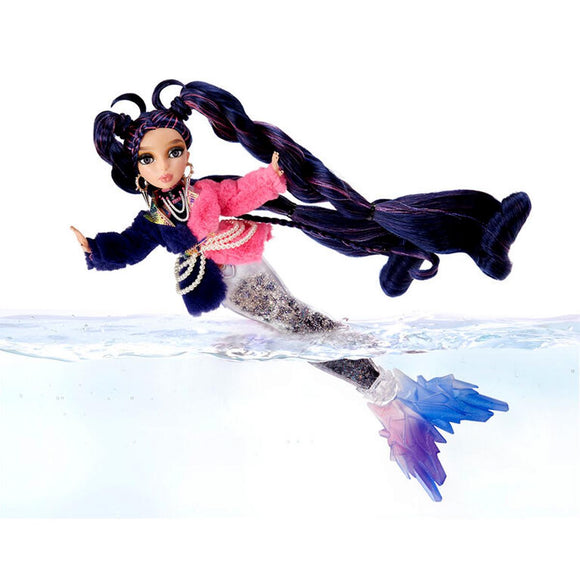 Each Mermaze Mermaidz Winter Waves doll has articulation points at the neck, shoulders, elbows, wrists, torso, waist, and fin to allow for so many poses! Use the included doll stand to put her on display! It turns out, mermaids are a lot like us! Nera is a fearless rebel who isn't afraid to go against the grain. With goth style, she loves the dark side of the ocean. A bit sarcastic, Nera does things her own way and doesn't feel the need to join the crowd. Nera guides Kishiko and Harmonique through Wintera to help them on their path to solve the mystery of the disappearing colors.