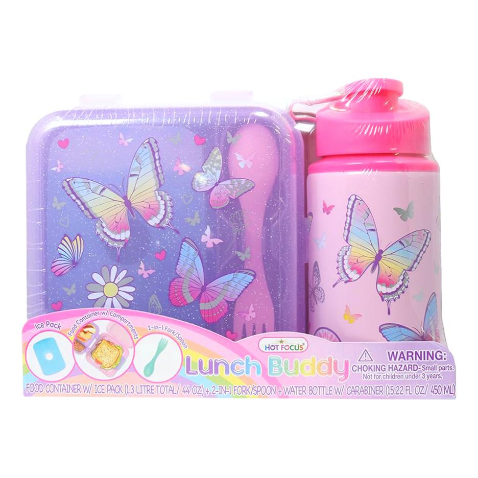 Hot Focus Butterflies Glitter Lunch Buddy Food Container Ice Pack Spork & Water Bottle w/Carabiner Clip
