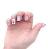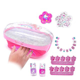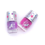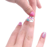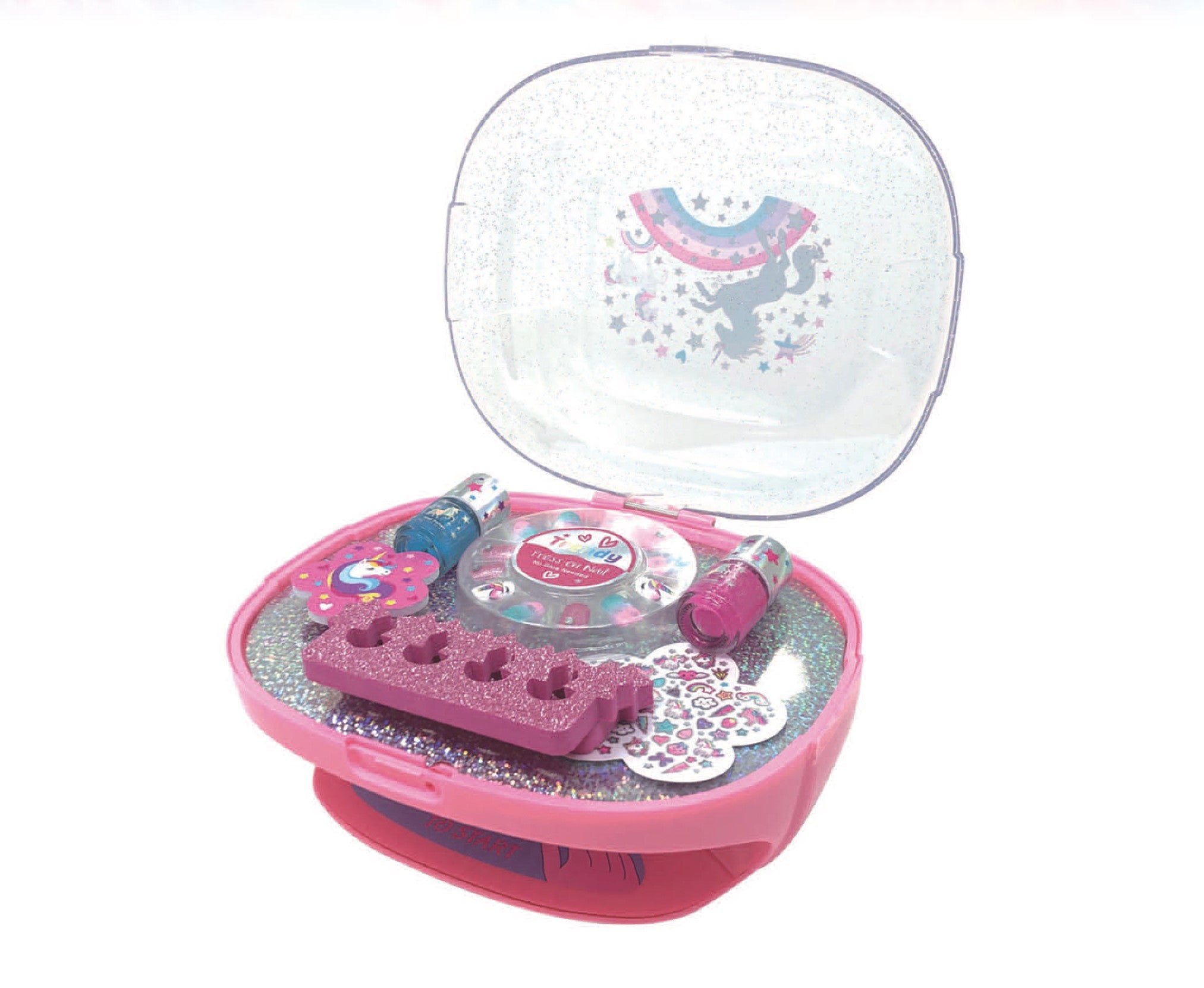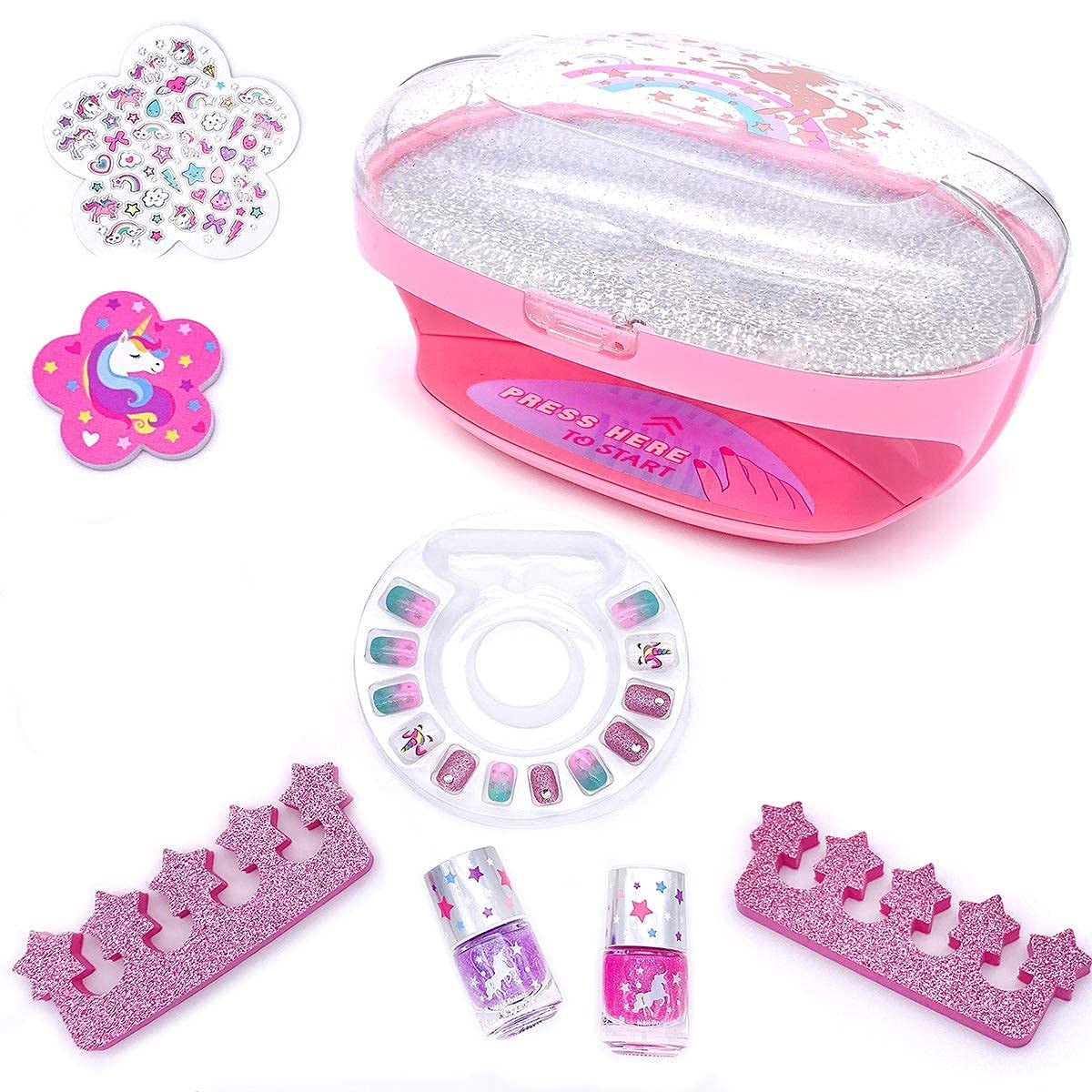 - Includes nail dryer w/storage compartment, 12 press-on nails, 2 pink glitter toe separators, 2 scented non-toxic peel off nail polishes 0.12-oz. each (purple & iridescent glitter blue), 1 unicorn nail file, and 1 sheet of fun nail stickers