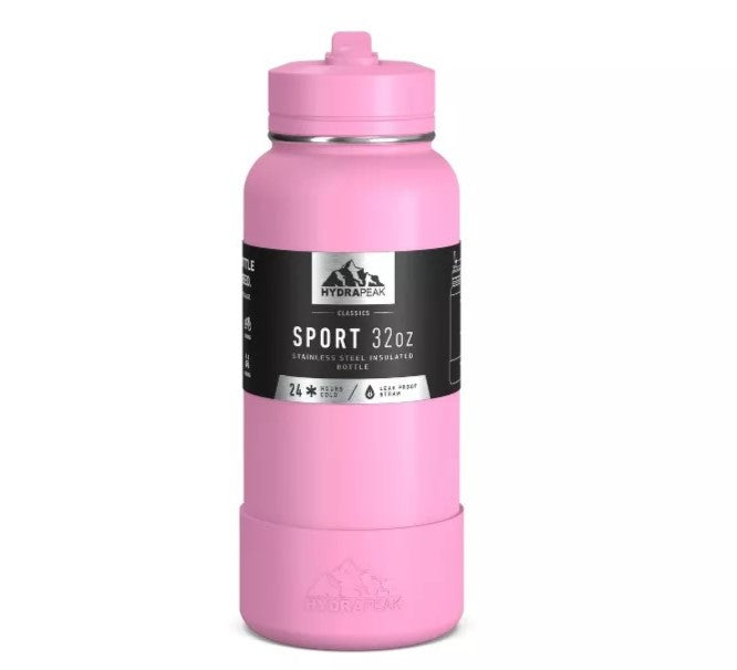 HydraPeak Classics Bubblegum Pink Wide Mouth Sport 32oz Stainless Steel Insulated Bottle w/Flip Top Carry Handle Lid