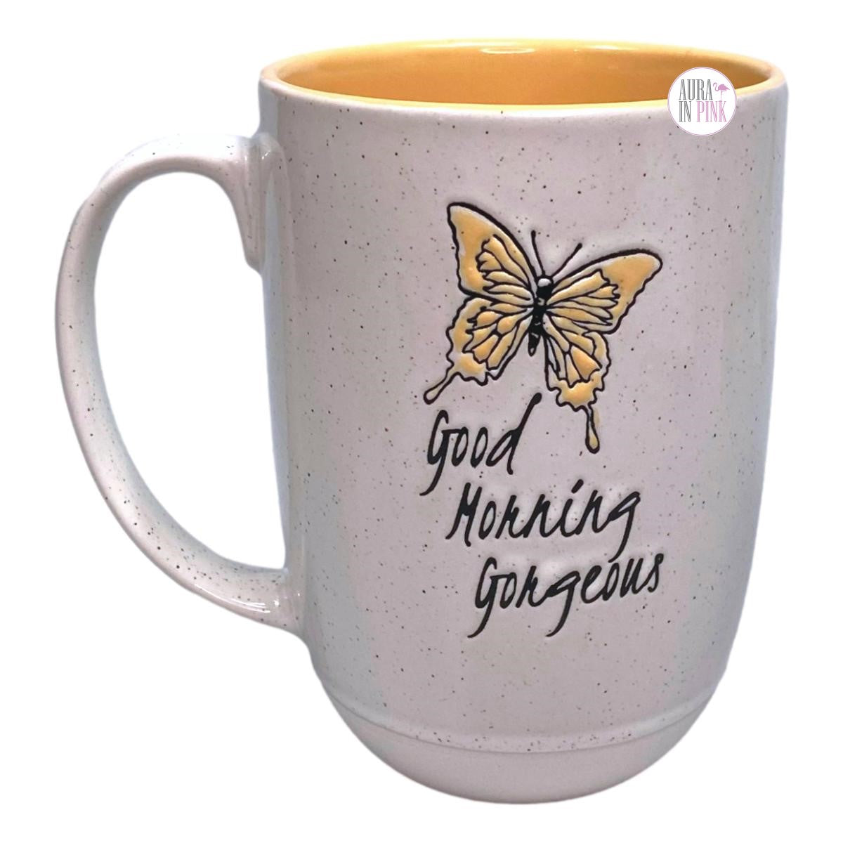 Wake up in a good mood with this gorgeous I Heart It Good Morning Gorgeous Butterfly Breeze Speckled Ceramic Coffee Mug! This dual-sided debossed "Good Morning Gorgeous" wording and yellow butterfly graphics on a cream-colored speckled mug also features a matching glazed yellow interior.