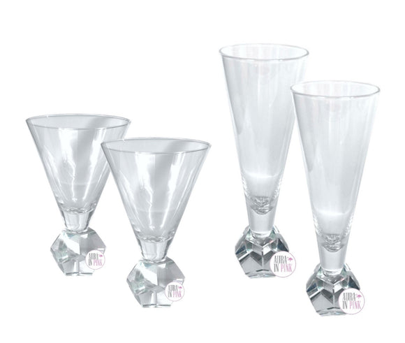 • Clear glass with weighted laser-cut crystal bases