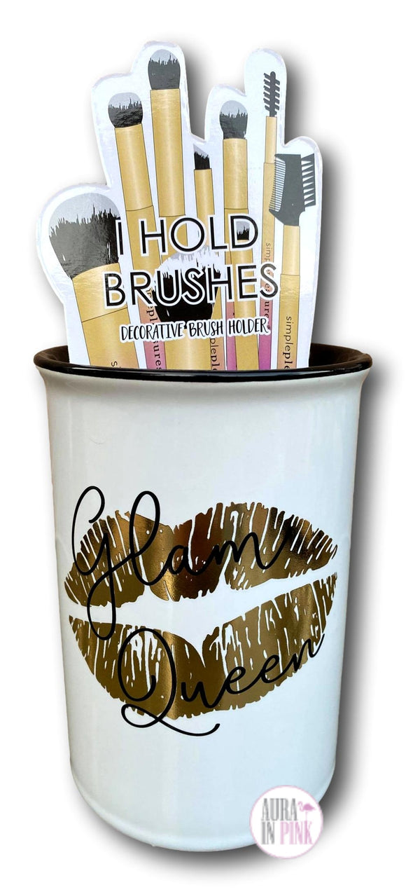 This Votum Multi-Purpose Ceramic Organizer - Glam Queen Gold Lipstick Kiss is an absolutely fabulous organizer! It holds makeup brushes, artist brushes, pens, pencils, makeup, plants, and so much more! It features glamorous black font and reflective gold lip graphics. Food safe, it can also be used as a cup!